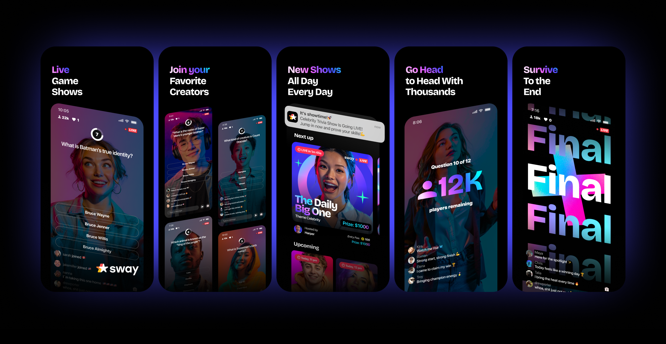 Sway is where live game shows happen every day. Compete in real time, survive through every round, and share real prizes.